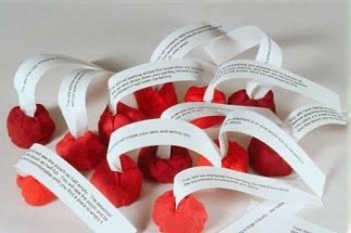 Image Description: Twelve round red pieces of clay sit grouped on a flat neutral-coloured surface with long thin pieces of paper coming out of the middle of each red clay ostomy “cookie.” The pieces of stark white paper have varying lengths of text printed on them.