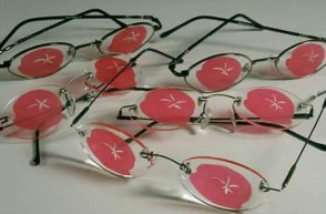 Image Description: Five pairs of glasses (two with black rims and three without) have reddish-pink stoma-shaped plastic stickers on their lenses. They lie on a neutral-coloured flat surface, and a soft light source outside of the picture frame creates interlocking shadows from the glasses’ frames.