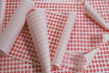 Image Description: Several sheets of paper with many roundish red ostomy shapes stamped in neat rows lie partially unrolled on a flat surface.