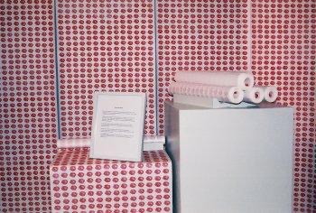 Image Description: Long sheets of paper with hundreds of red ostomy stamps line the wall and lay rolled up on two square metal boxes of different heights.