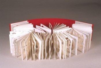 Image Description: White circle templates from boxes of ostomy supplies are folded into an accordion book. A long plain red piece of paper functions as the book cover.