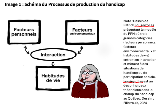 C’est dans une volonté de rompre avec cette idée que se développe au Canada durant les années 1990 le Processus de production du handicap (PPH). Ce modèle, qui constitue probablement l’approche conceptuelle la plus populaire au Québec dans le champ du handicap, est une des rares conceptualisations du handicap qui a été initialement pensé en français. Ce cadrage, qui s’inspire notamment de la théorie écosystémique de Bronfenbrenner (1977), considère « le caractère situationnel du handicap comme résultat de l’interaction-personne/environnement et se traduisant par une restriction de la qualité de réalisation des habitudes de vie de la personne ayant des incapacités » (Fougeyrollas, 2002, p. 10).