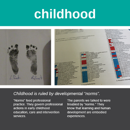![]() Figure 1: childhood Image description: The image above is a series of 4 boxes. The top box, Box 1, is the title and reads “childhood” in white lettering against a blue-green background. Below on the left is a second box, Box 2, with a piece of white paper with two, small black-inked footprints labelled L. Foot and R. Foot. On the right is Box 3 with a picture of an assessment tool. The tool is made up of 3 columns labelled as performance criteria. The middle column is title “visual performance”. To the left of each line of text is a series of small boxes, some of these boxes are shaded in red or blue and others are left blank. Below, in the 4th and final box, is text which reads: “Childhood is ruled by developmental ‘norms.’ ‘Norms’ feed professional practice. They govern professional actions in early childhood education, care and intervention services. The parents we talked to were troubled by “norms”. They know that learning and human development are embodied experiences”. |