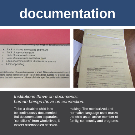 ![]() Figure 2: documentation Image description: The image above is a series of 4 boxes. The top box, Box 1, is the title and reads “documentation” in white lettering against a blue background. Below on the left is a second box, Box 2, with a picture of a white piece of paper with a bulleted list that reads: “lack of shared interest and enjoyment, lack of appropriate gaze, lack of response to name, lack of response to contextual clues, lack of communicative utterances or sounds, lack of pointing. Underneath partial sentences are visible. The text reads “the total number of correct responses in a test. This can be converted into a ...ndard score between 85 and 115 are considered average for a child’s age…on a test with a group of children of similar age. Percentile ranks between”. On the right is Box 3 with a picture of a stack of cream colour papers that are duplicates of handwritten notes on papers with the name of an organization written at the top. Below, in the 4th and final box, is text which reads: “Institutions thrive on documents: human beings thrive on connection. To be a disabled child is to be continuously documented. But documentation separates “conditions” from whole lives; it fosters disembodied decision-making. The medicalized and normative language used masks the child as an active member of family, community and programs.” |