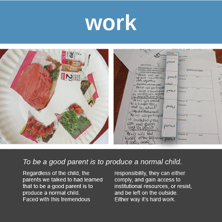 ![]() Figure 3: work Image description: The image above is a series of 4 boxes. The top box, Box 1, is the title and reads “work” in white lettering against a light blue background. Below on the left is a second box, Box 2, with a paper plate with pictures of food cut out and arranged on it. On the right is Box 3 which is a piece of paper with a table made up of three columns and 5 rows with handwriting in the left and middle row. The first column is titled, “Outcomes/Goals – Reflects family’s priorities, developmental needs, and EI observations”. Handwritten notes are visible in this column. The second column is title, “Persons responsible”. The text in the middle row is raised for emphasis, and all of the boxes in this column have the word “parent” handwritten below. The third column is titled, “review outcomes” and is blank. Below, in the 4th and final box, is text which reads: “To be a good parent is to produce a normal child. Regardless of the child, the parents we talked to had learned that to be a good parent is to produce a normal child. Faced with this tremendous responsibility, they can either comply and gain access to institutional resources, or resist , and be left on the outside. Either way it's hard work”. |